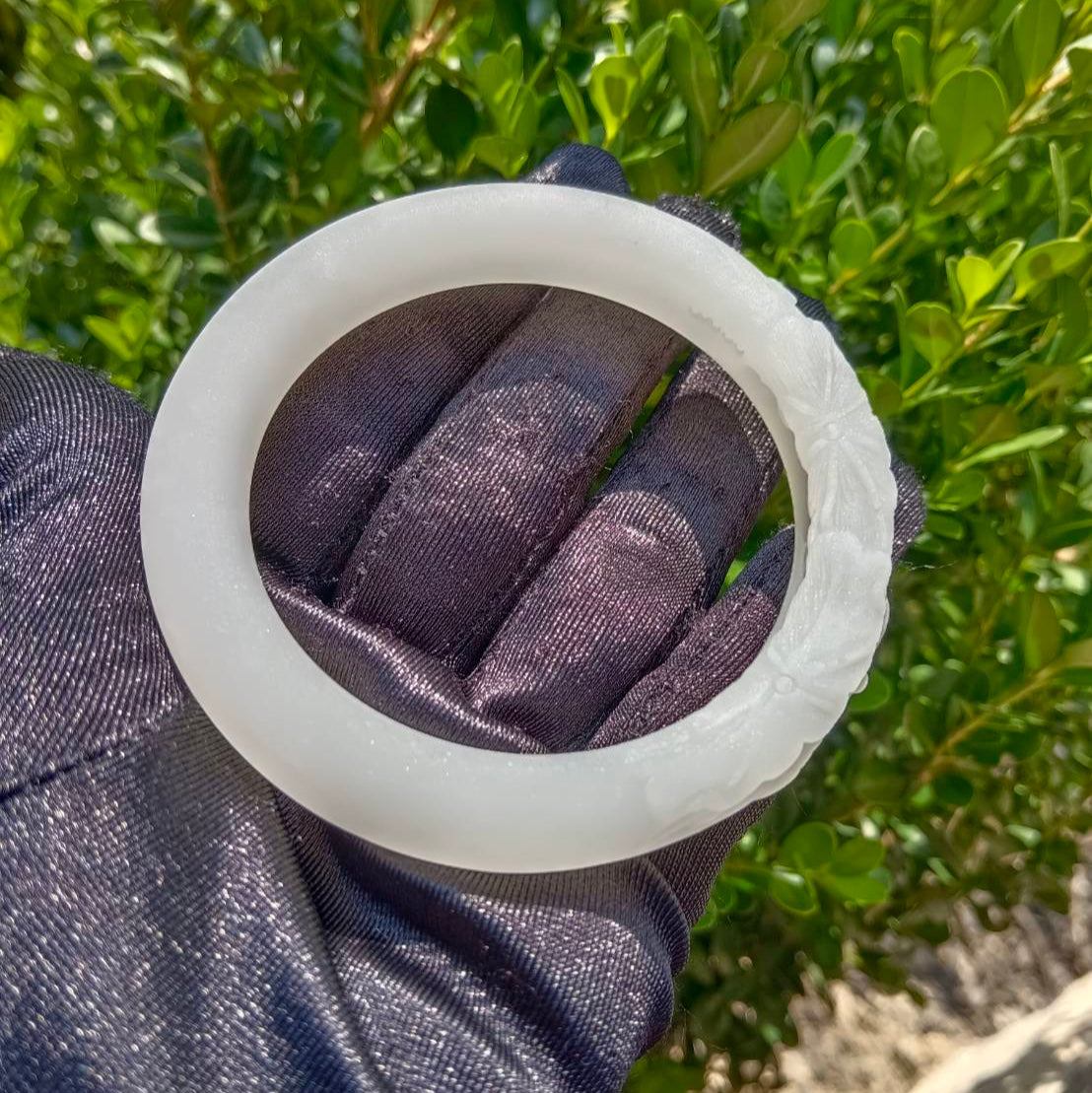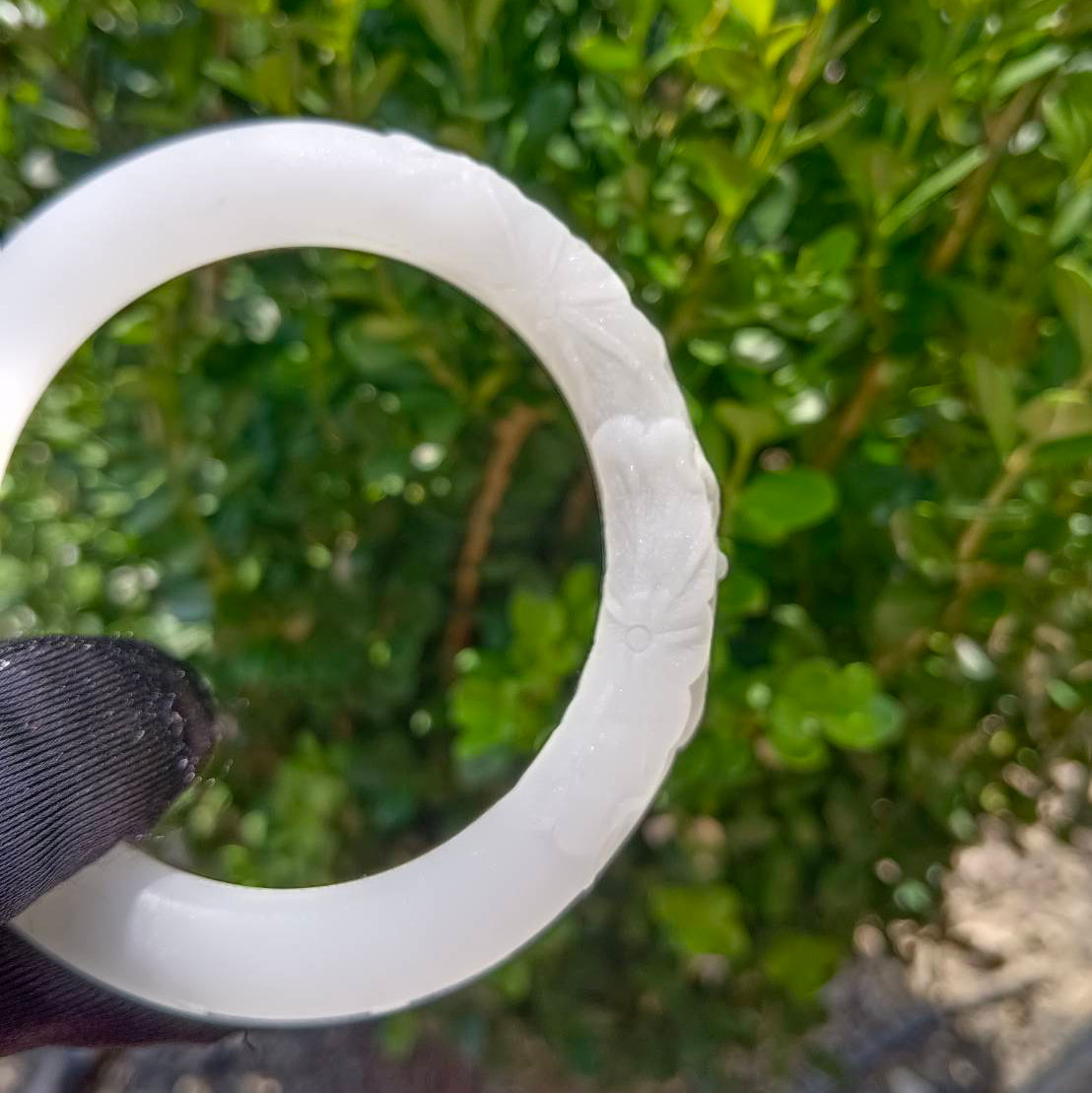 Measuring 57.8/11.5/10.5 mm and weighing 58 grams, this bangle offers a comfortable yet substantial presence on the wrist. The bracelet is further distinguished by its intricate hand-carved floral motif, which enhances its natural beauty and adds a layer of artistry and symbolism.