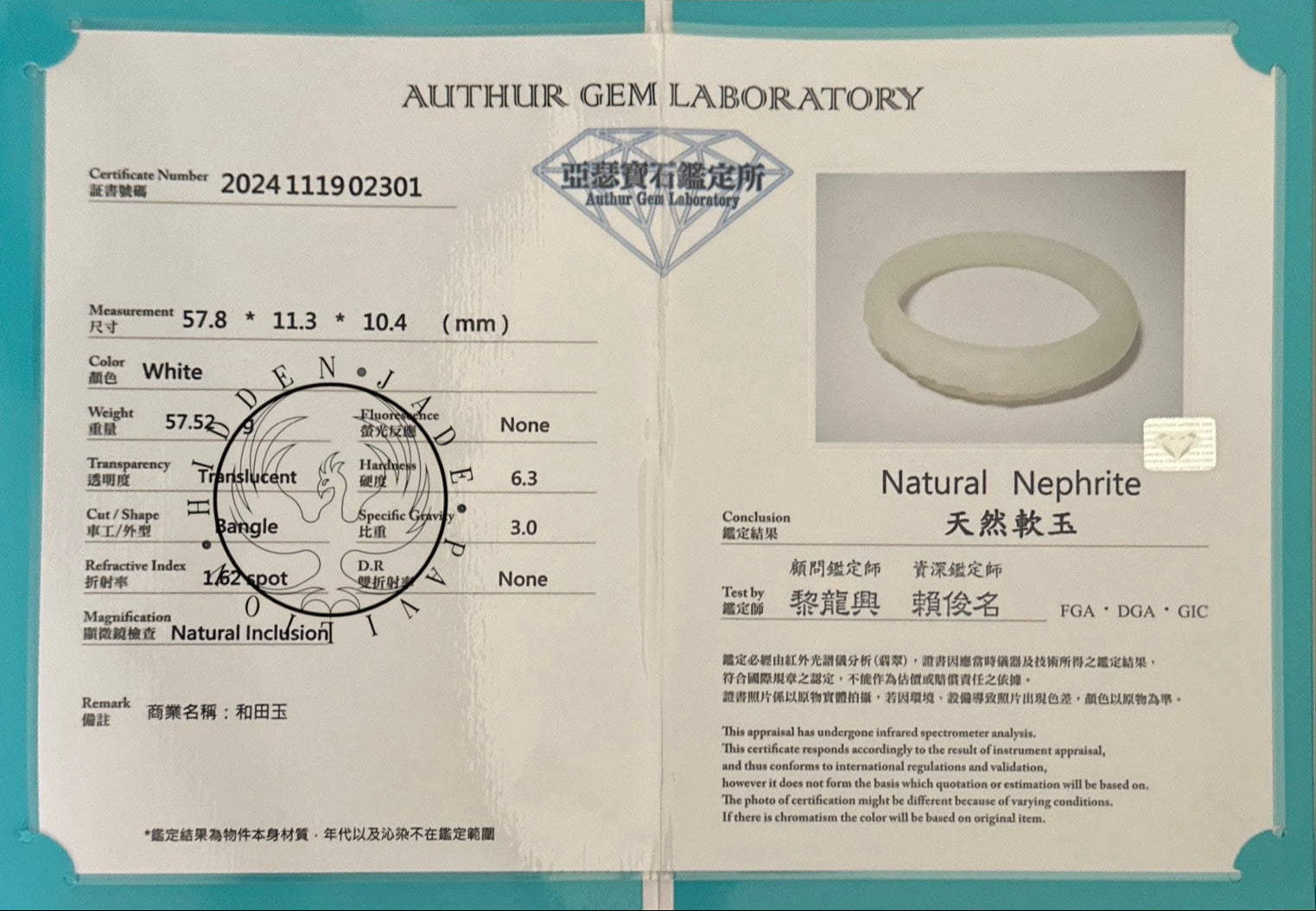 Certified by AGL (Authur Gem Laboratory) for authenticity, this bangle comes with the assurance of being natural, untreated jade (Type A), ensuring its long-lasting value. Its minimalist white elegance makes it versatile for everyday wear, while the carved details transform it into a statement piece suitable for special occasions.