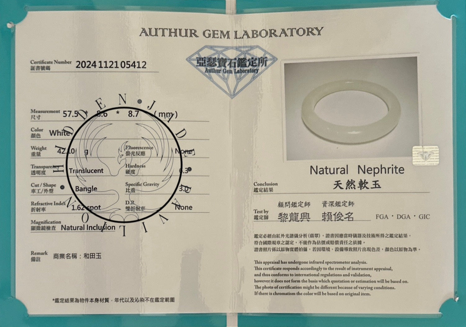 Natural White Nephrite Jade Bangle Bracelet – AGL Certified | 57.5/8.6/8.7 mm | 42.1 g