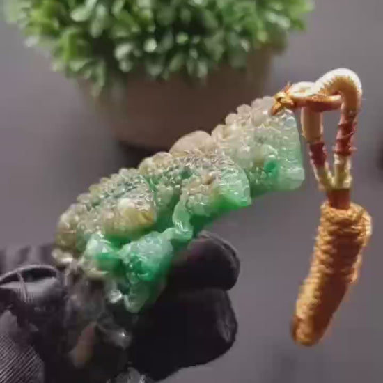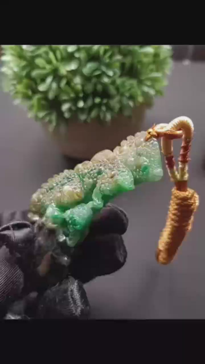 The Tri-Color Burmese Jadeite “Fishes Battling the Current” Pendant is a striking symbol of perseverance, vitality, and success. Expertly carved from natural Burmese jadeite, this pendant displays a vivid blend of emerald green, golden honey, and deep black — a rare tri-color combination that brings both visual depth and symbolic power.